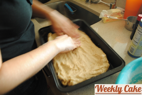 Once that was all mixed up, it was time to spread the risen dough in the 9×13 inch pan.