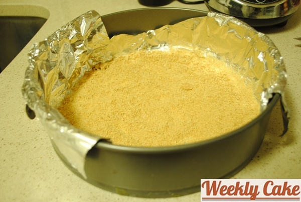 The first step was to sprinkle to graham cracker crumbs on the bottom of a foil-lined and sprayed pan. I opted for a springform pan as opposed to a 9×13 pan as used in the above video.