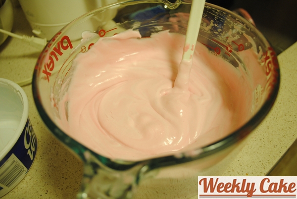 The final step was to fold in the Cool Whip. This is where I got a little lazy and didn’t fully blend the mixture, which resulted in a marbled cake. I didn’t want to mix the batter too much for fear the Cool Whip would collapse.