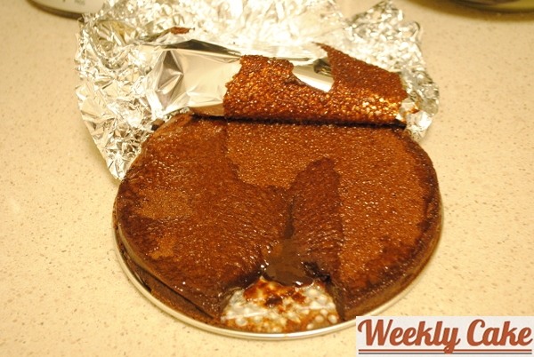 I cut myself a little sliver and it was a little runny. It tasted like Nutella… and eggs. I reasoned I didn’t let the cake cool enough. So I let it sit overnight, covering it with foil.