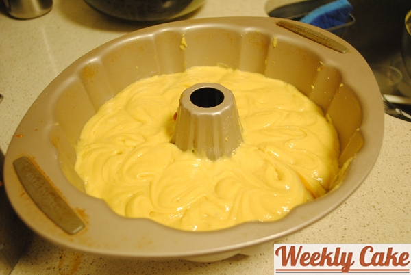 4. Pour half the prepared batter into the bundt pan.