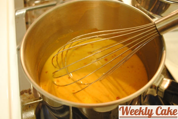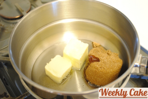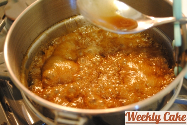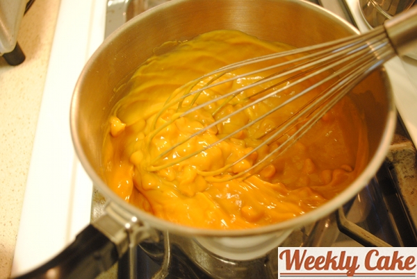 I let the cake chill out, covered, overnight. The next morning I prepared the glaze. I mixed sugar, butter, and corn syrup in a saucepan over a medium heat.