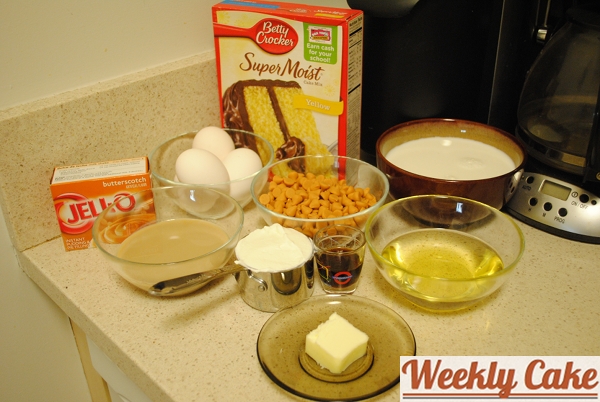 Here’s my mise en place. I was using all the measurements from the Tunnel of Fudge Cake, replacing butterscotch chips for chocolate chips, butterscotch pudding for chocolate pudding, and yellow cake mix for devil’s food.