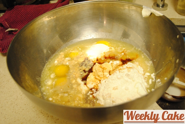 Then the filling got runny. It was like butterscotch soup. I realized this was likely because the pudding mix was instant and was meant to be prepared in a fridge, not in a saucepan over medium heat. I refrigerated the mixture in hopes it would thicken. Meanwhile, I made the cake batter. This was the easiest part. Just dump the cake mix, oil, eggs, sour cream, and Baileys into a large bowl and mix!