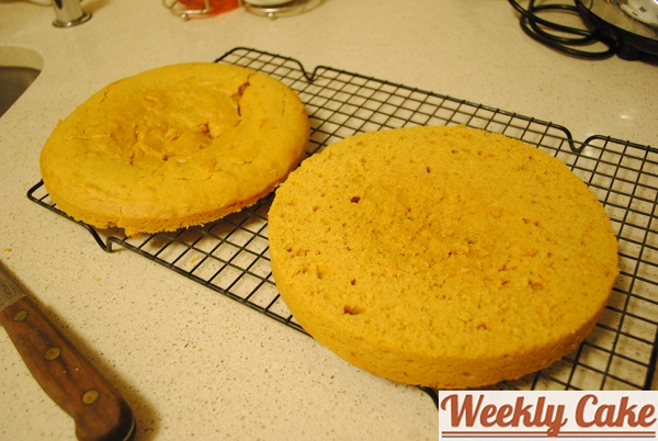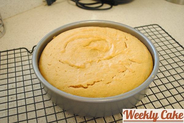 - Pour batter into prepared pan. Bake cake until center springs back when touched, about 20-25 minutes. Cool cake in pan on rack 10 minutes. Using small butter knife or offset spatula, cut around sides of pan to loosen cake. Turn out onto rack; cool completely. Slice in half crosswise with a bread knife if two layers are desired.